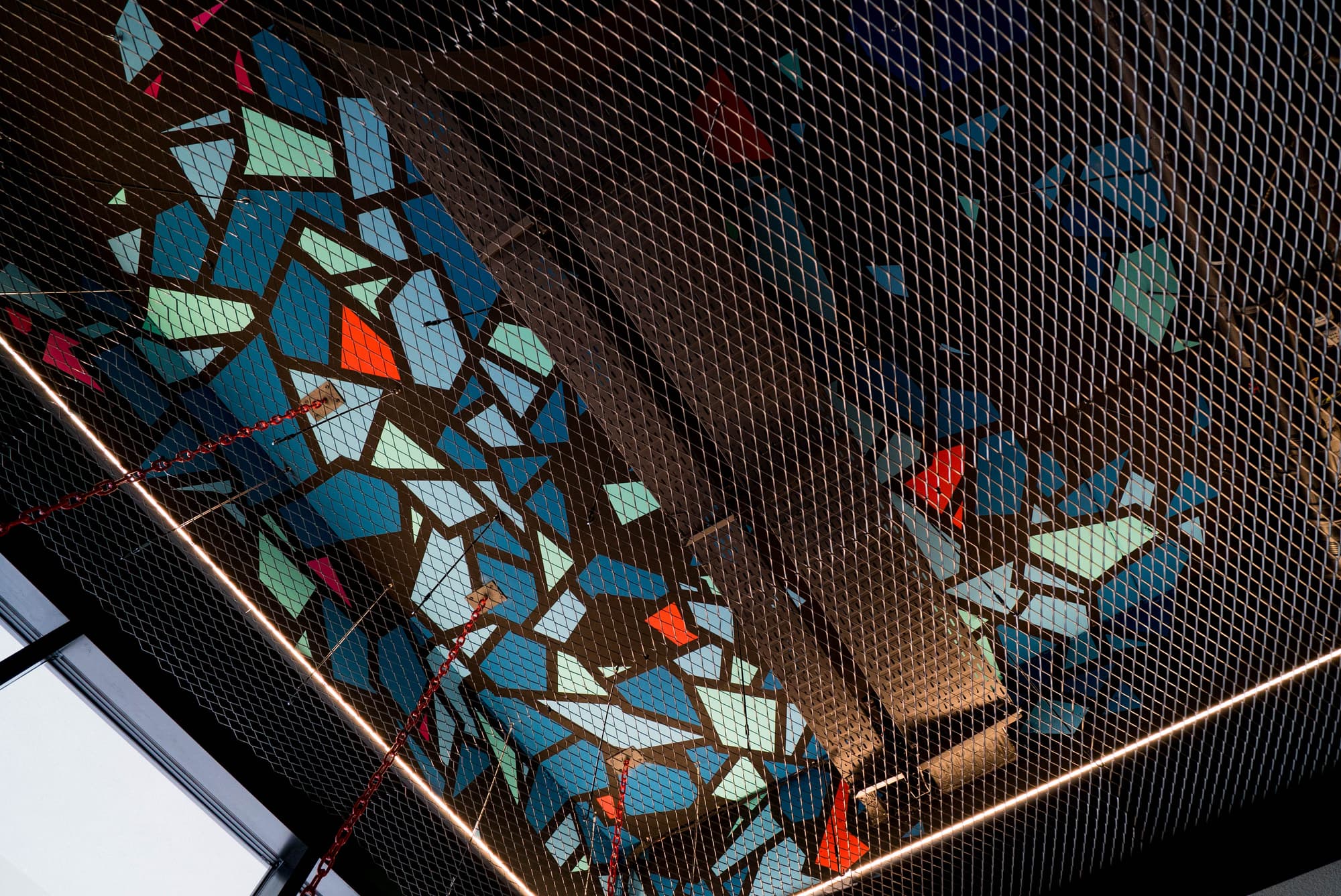 So entwickelte sich das riesige mosaikartige Deckengemälde, welches sein Farbspektrum von einem Ende des Raumes zum anderen Ende fließend verändert. Zu der Deckenbemalung bekamen die Wände 3 großflächige Murals im urban inspirierten Stil. Auf diese Weise wurde den eintönigen Innenräumen des Restaurants ein neues Leben eingehaucht.